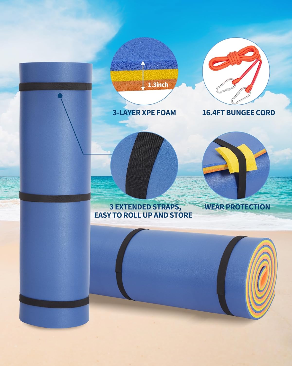 - Includes Essential Accessories – Each floating water pad mat also comes with a 16.4’ elastic bungee tether to help you safely anchor the mat to a dock or stationary point by the edge of a lake, as well as custom hook-and-loop straps for quick, easy storage.