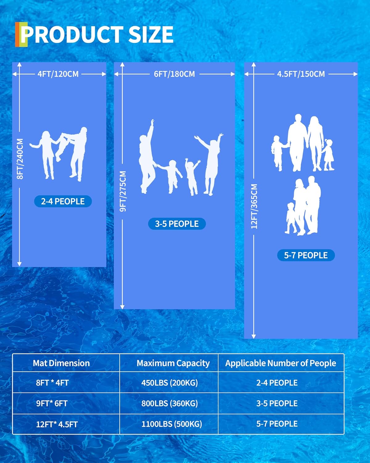 - The GarveeLife Lily Pad Floating Mat comes in three versatile sizes to fit every occasion! The compact 8x4ft comfortably holds 2 adults, ideal for romantic getaways or solo relaxation. Upgrade to the 9x6ft version for 3-5 people - perfect for family fun or friend hangouts. Need maximum space? The massive 12x4.5ft model accommodates 5-7 people, turning your pool or lake into an instant floating party zone!